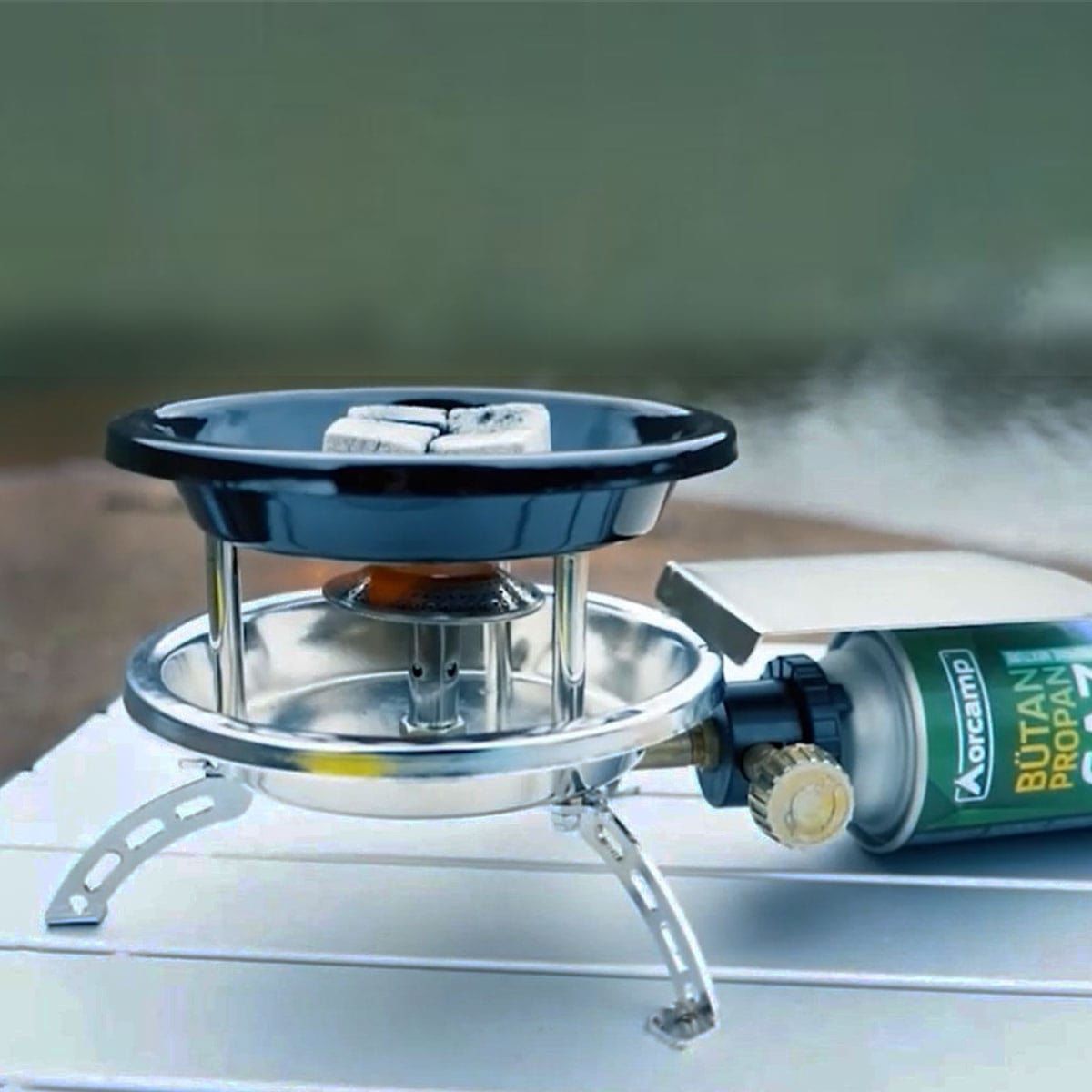Orcamp Yan Kartuşlu Katlanır Ayaklı Nargile Köz Ocağı Pratik ve hızlı köz hazırlamak ve aynı zamanda kamp ocağı olarak yiyecek közlemek içinde kullanılabilir bir tasarıma sahiptir.